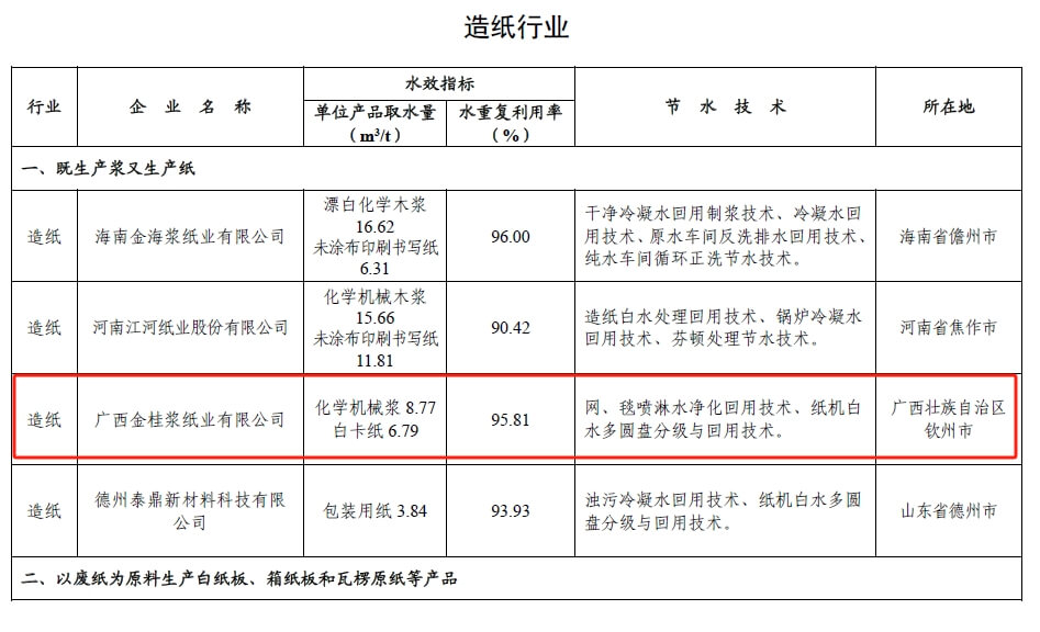 广西有两家企业荣获此荣誉,贵港的台泥(贵港)水泥有限公司的节水技术:污水处理回用技术、雨水收集利用技术,单位产品取水量0.060m3/t,水重复利用率99.50%;钦州市的广西金桂浆纸业有限公司的节水技术:网、毯喷淋水净化回用技术、纸机白水多圆盘分级与回用技术,单位产品取水量:化学机械浆 8.77m3/t、白卡纸 6.79m3/t,水重复利用率95.81%。