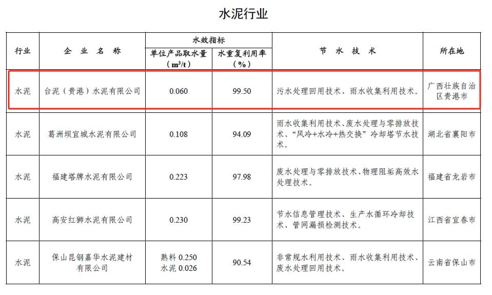 广西有两家企业荣获此荣誉,贵港的台泥(贵港)水泥有限公司的节水技术:污水处理回用技术、雨水收集利用技术,单位产品取水量0.060m3/t,水重复利用率99.50%;钦州市的广西金桂浆纸业有限公司的节水技术:网、毯喷淋水净化回用技术、纸机白水多圆盘分级与回用技术,单位产品取水量:化学机械浆 8.77m3/t、白卡纸 6.79m3/t,水重复利用率95.81%。
