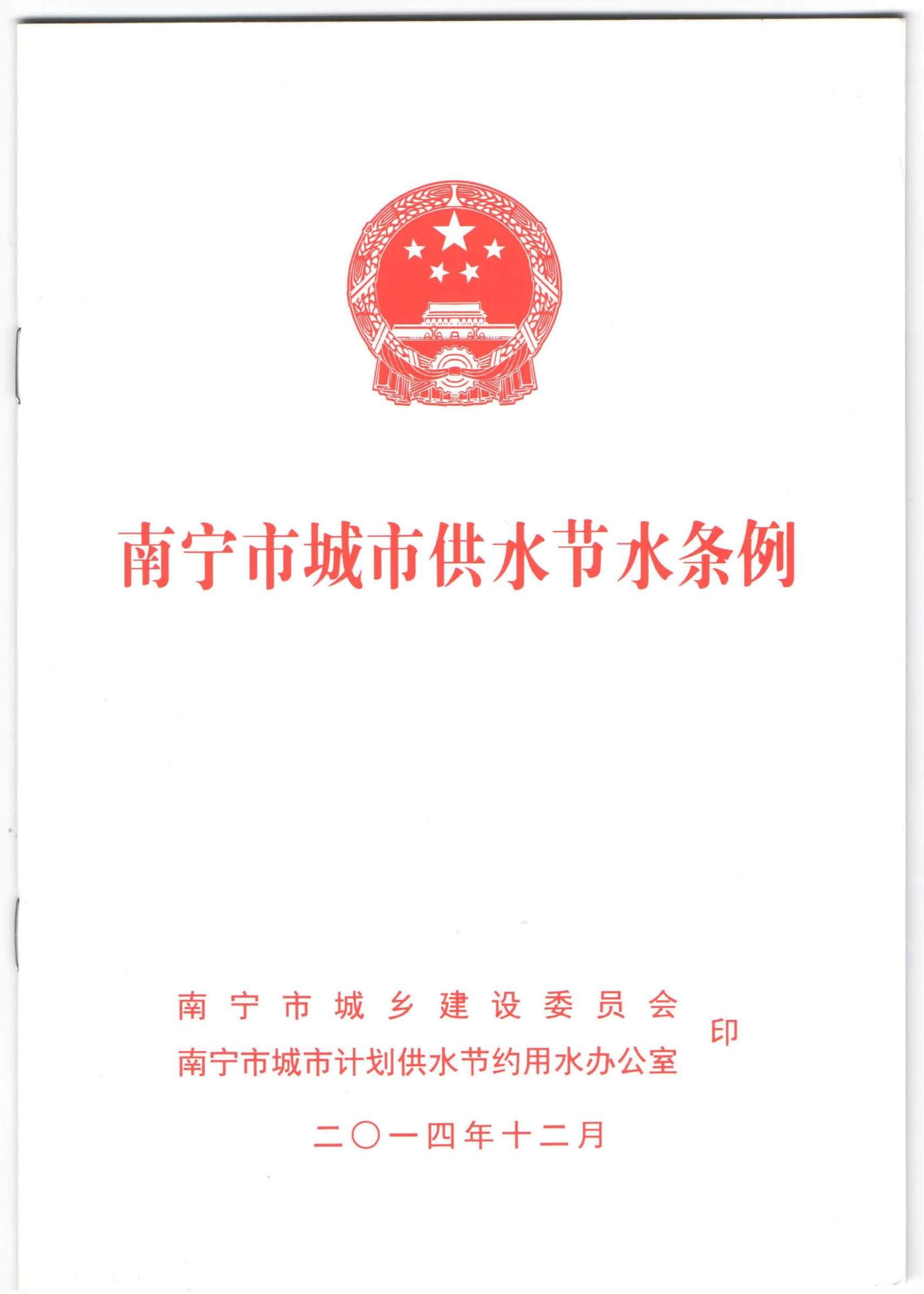 《南宁市城市供水节水条例》(点击这里下载全文)已由南宁市第十三届人民代表大会常委员会第二十一次会议于2014年5月21日通过,经广西壮族自治区第十二届人民代表大会常务委员会第十三次会议于2014年11月28日批准,现予公布,自2015年1月1日起施行。